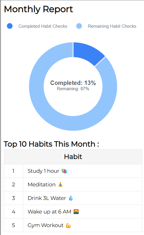 Review the bigger picture with a clear monthly view and completion breakdown. Spot patterns, celebrate wins, and plan the month ahead with confidence.